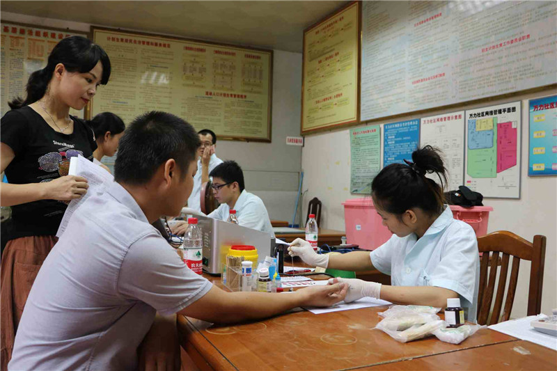 在万力社区流动献血现场,大家热情高涨,踊跃参与,依序进行献血登记、填表、量血压、测血型等,顺利通过之后再进行采血。